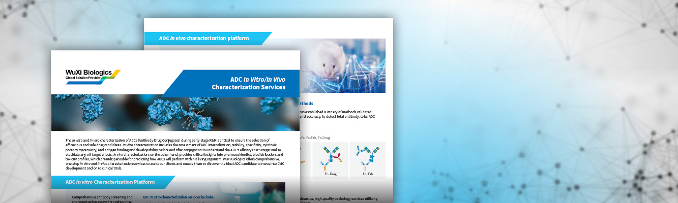 The in vitro and in vivo characterization of ADCs (Antibody-Drug Conjugates) during early-stage R&D is critical to ensure the selection of efficacious and safe drug candidates. WuXi Biologics offers comprehensive, one-stop in vitro and in vivo characterization services to assist our clients and enable them to discover the ideal ADC candidate to move into CMC development and on to clinical trials.