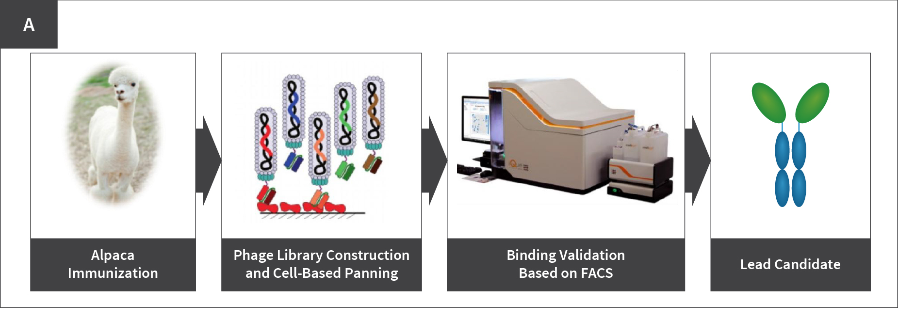 Figure A: An overview of the display workflow, including alpaca immunization, phage library construction and cell-based panning, binding validation, and lead candidate identification.
