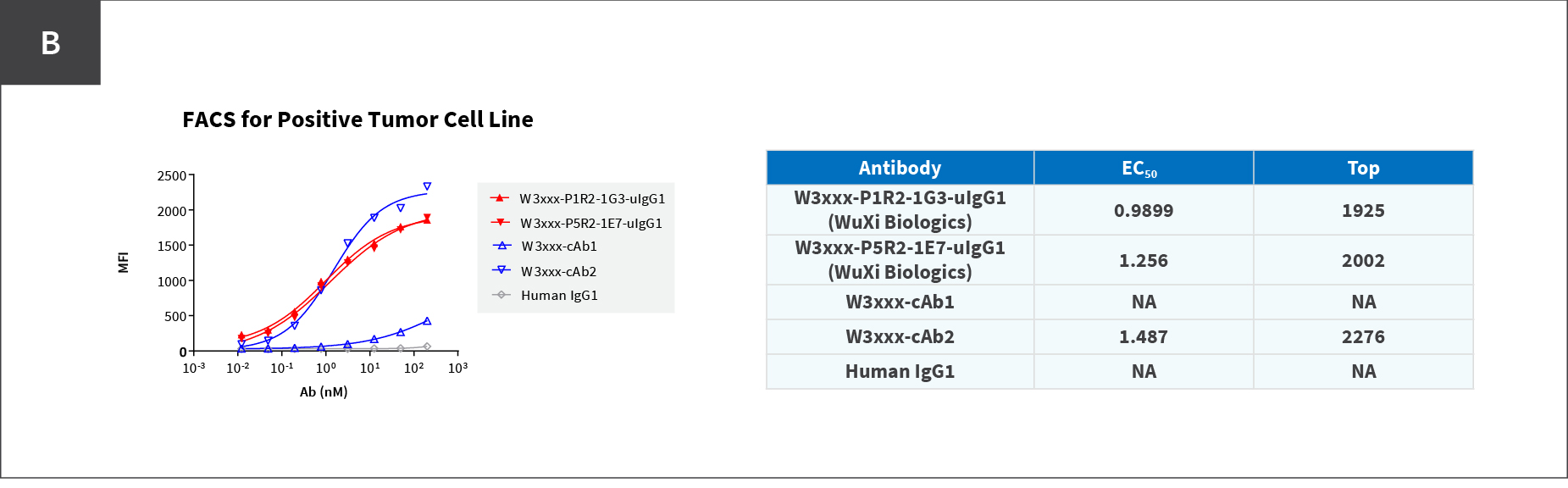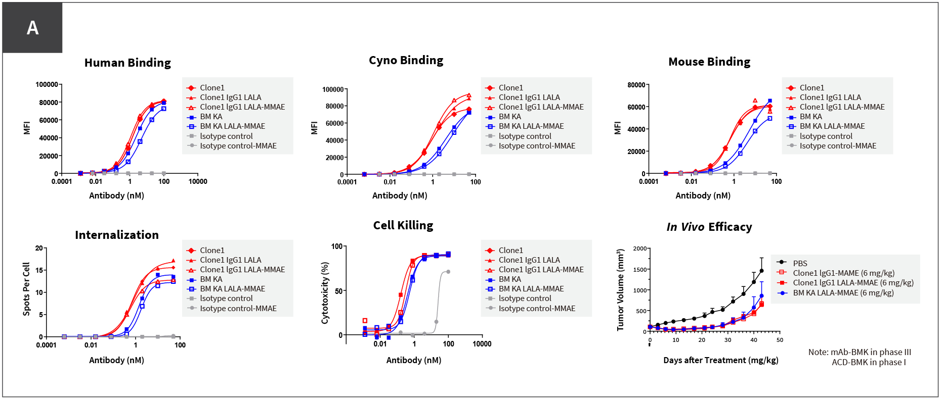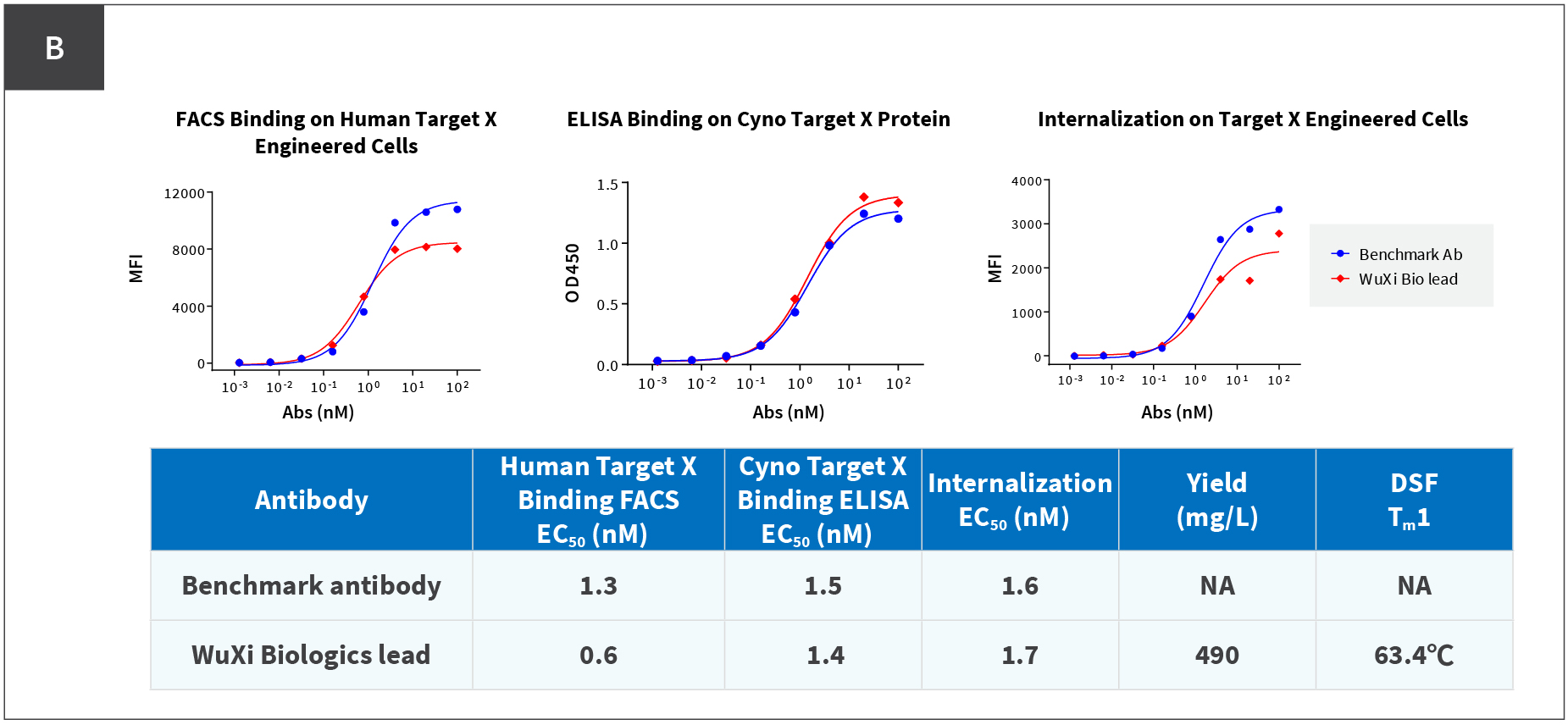 Figure A: The identified antibody demonstrated an enhanced specific binding positive rate (red curve) compared to the benchmark antibody (blue curve). Additionally, these leads candidates exhibited enhanced internalization and efficient in vivo tumor cell killing, positioning them as ideal candidates for ADC development.