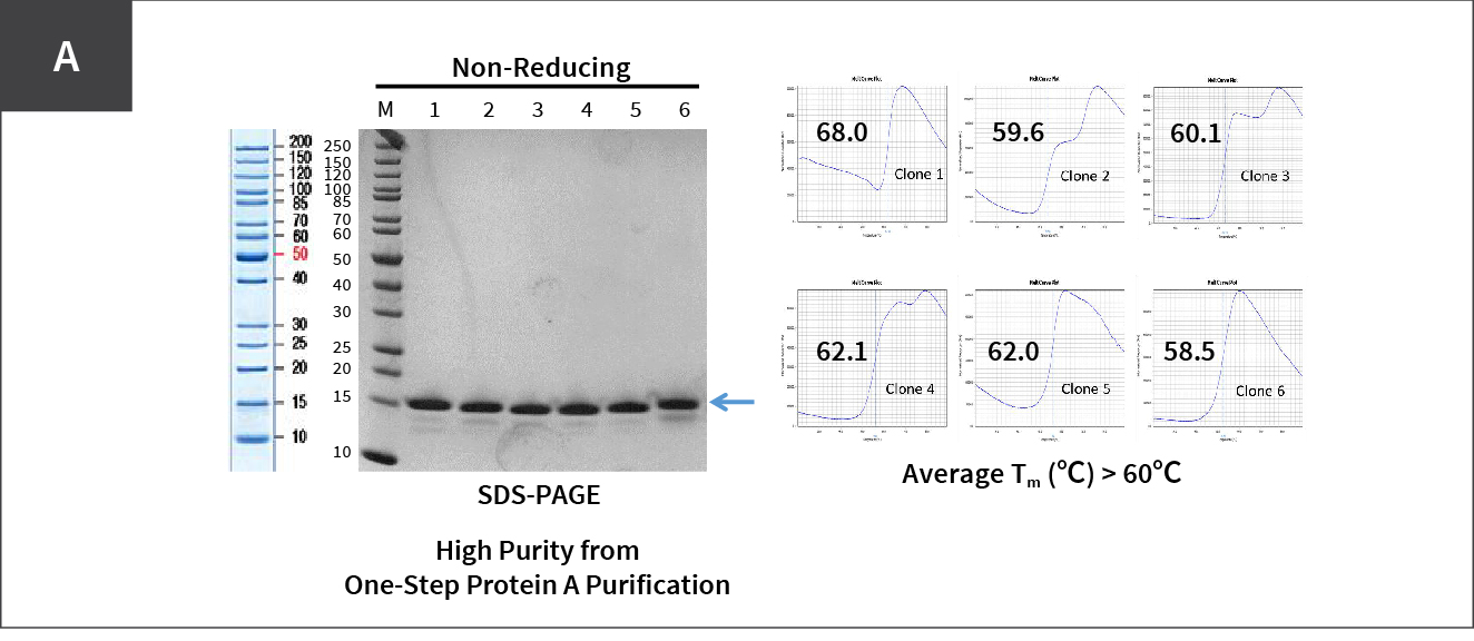 Figure A: Our humanized VHH synthetic library was designed and developed based on stable scaffolds. We obtained high-purity display library through single-step Protein A purification, as confirmed by SDS-PAGE. The library also demonstrated enhanced developability with an average Tm value exceeding 60 °C.