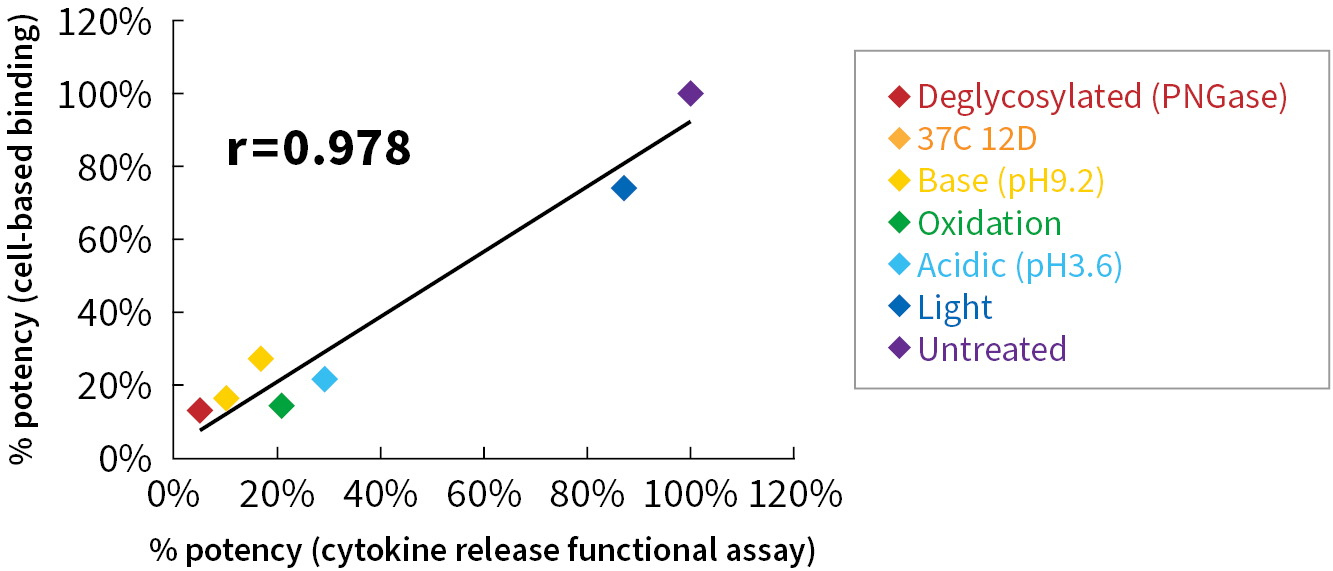 A case study of our bioassay method development service demonstrates strong utility in early-stage biologic product development. The data demonstrates a high correlation (r = 0.978) between the potency of a cell-based binding assay and the potency of a cytokine release functional assay across various treatment conditions. The high correlation suggests that the cell-based binding assay reliably predicts later-phase outcomes.