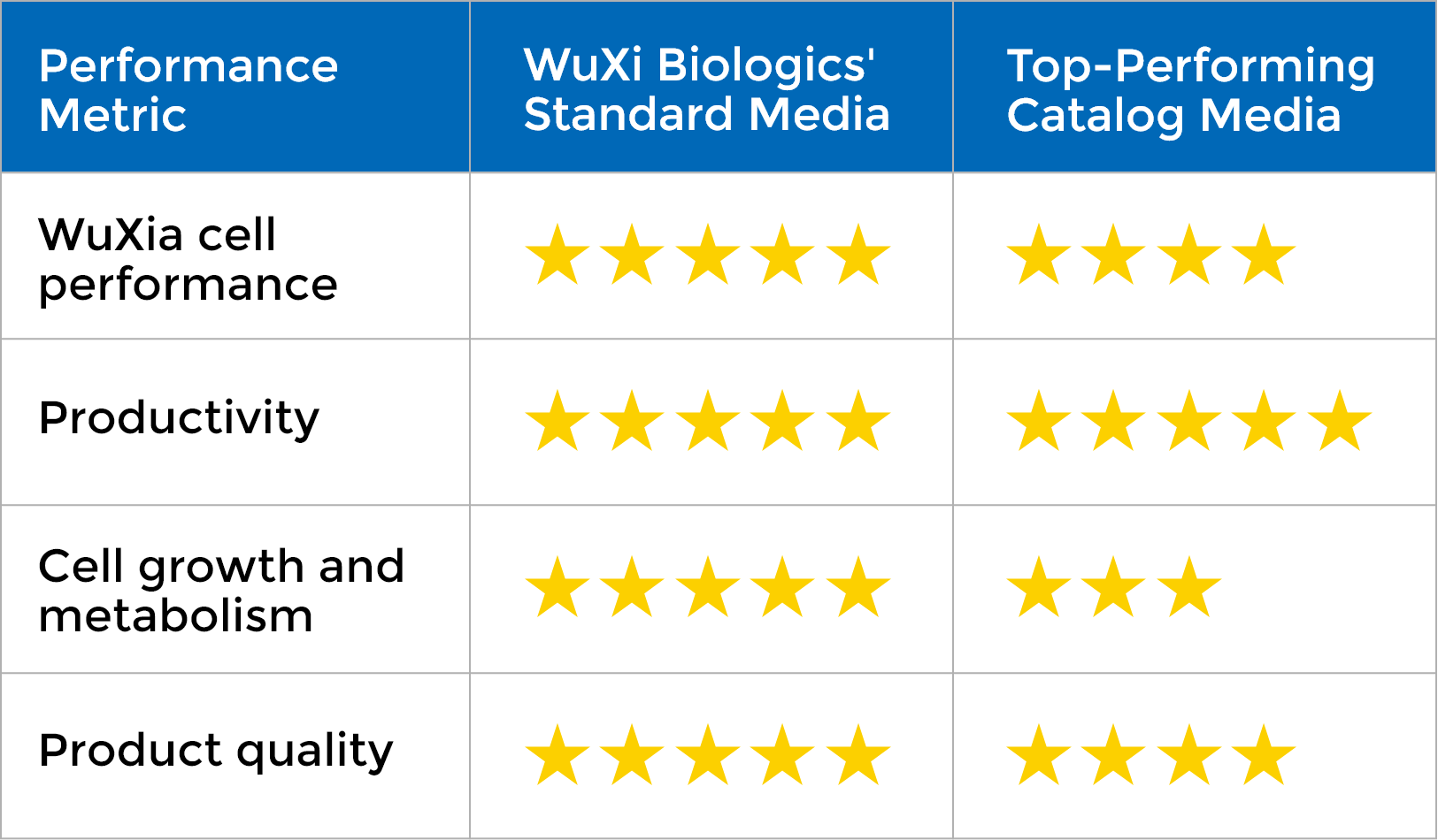 WuXi Biologics leverages a culture medium library of basal and feed media to accelerate screening and customize formulation selection for your cell line. Detailed growth and performance data guide decision-making, helping you reach target titer and quality in only 1 to 2 months.