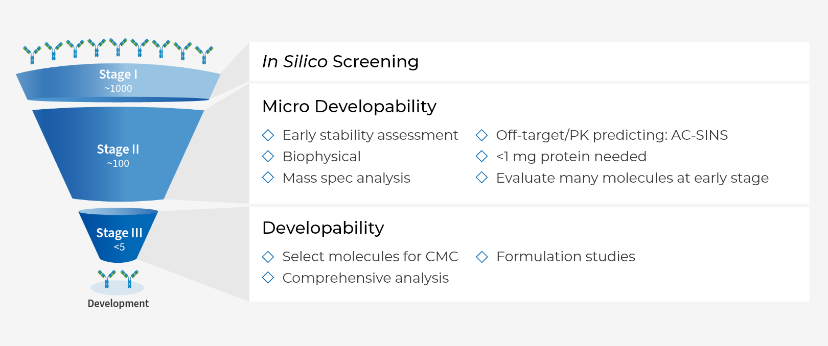 Micro developability consists of a series of high-throughput assays routinely conducted in mature pharmaceutical companies. The assays allow lead molecules to be examined at earlier stage using minimal material. Most of the assays can be completed within 2 weeks using in total less than 1mg protein. This will allow molecules being advanced to next stage with greater chances of success. For small biotech companies, early micro developability result also allows more accurate valuation of their assets for any business opportunities.