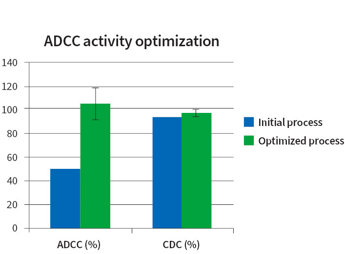 • Adding medium components allowed ADCC activity adjustment and without significant impact on CDC activity. Both ADCC and CDC were within target range after optimization.