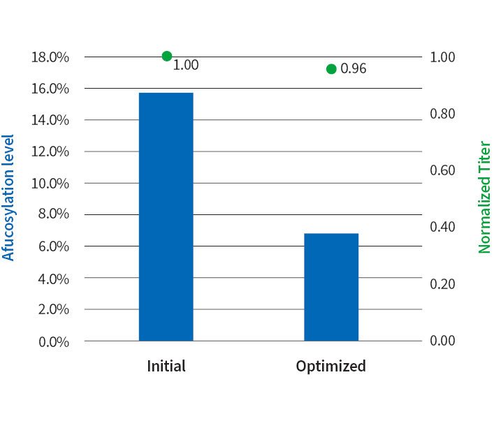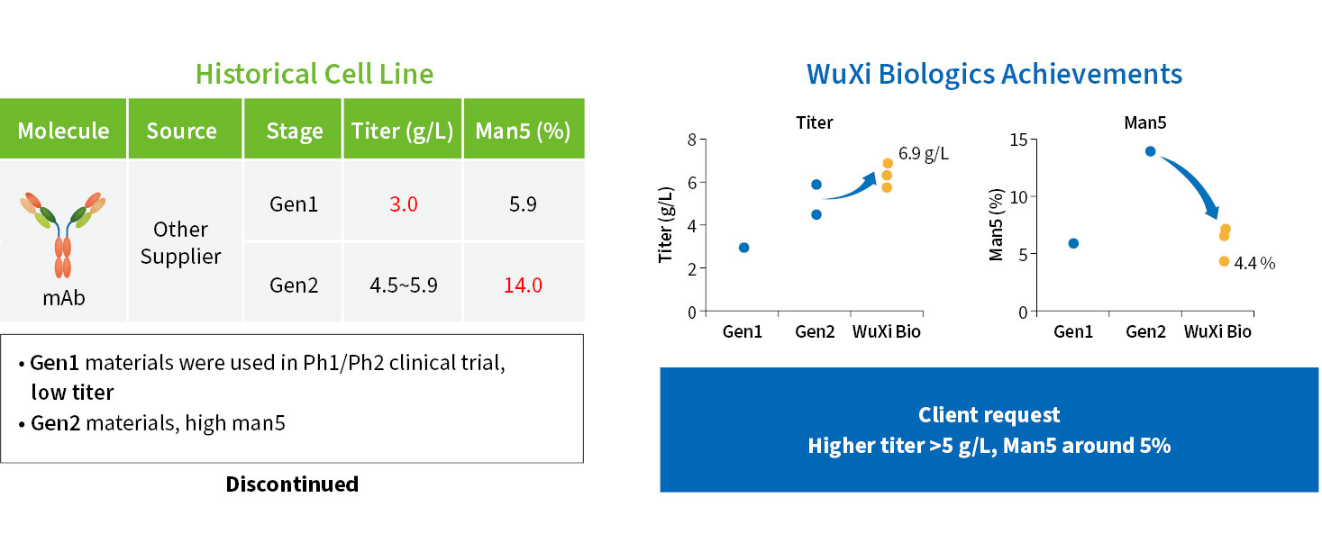 A client reached out to WuXi Biologics to redevelop, starting with cell line development, a monoclonal antibody (mAb) that was developed at a third party CDMO. The reason for the redevelopment was due to undesirable levels (>14%) of mannose (Man5) on the molecule, despite the fact that the cell line had other strong quality attributes such as product titer (5.9 g/L).