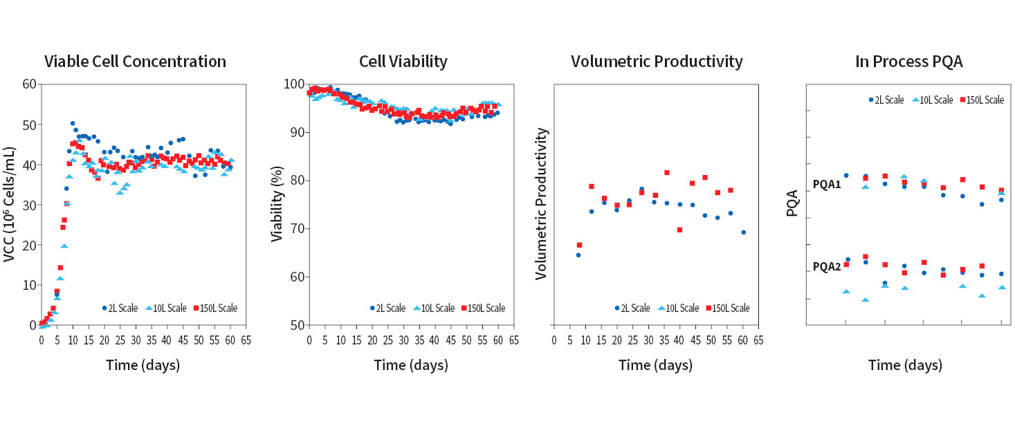 • Long term steady state perfusion (typically 60 days, up to 130 days) with stable cell growth performance, metabolism, productivity and PQA
