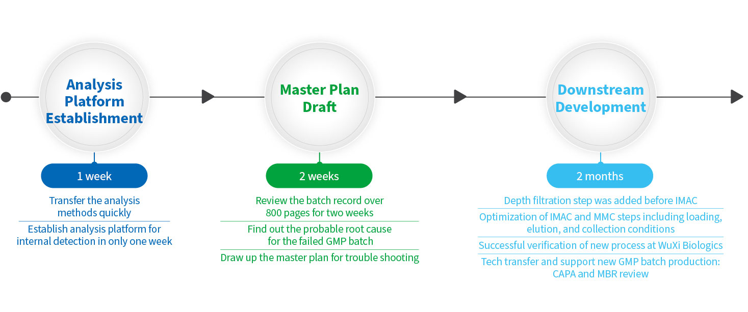 Client could not get a consistent product quality or GMP manufacturing process performance at current vendor.  Requested WuXi Biologics assemble a team from multiple functional areas to trouble-shoot manufacturing process and provide solutions.