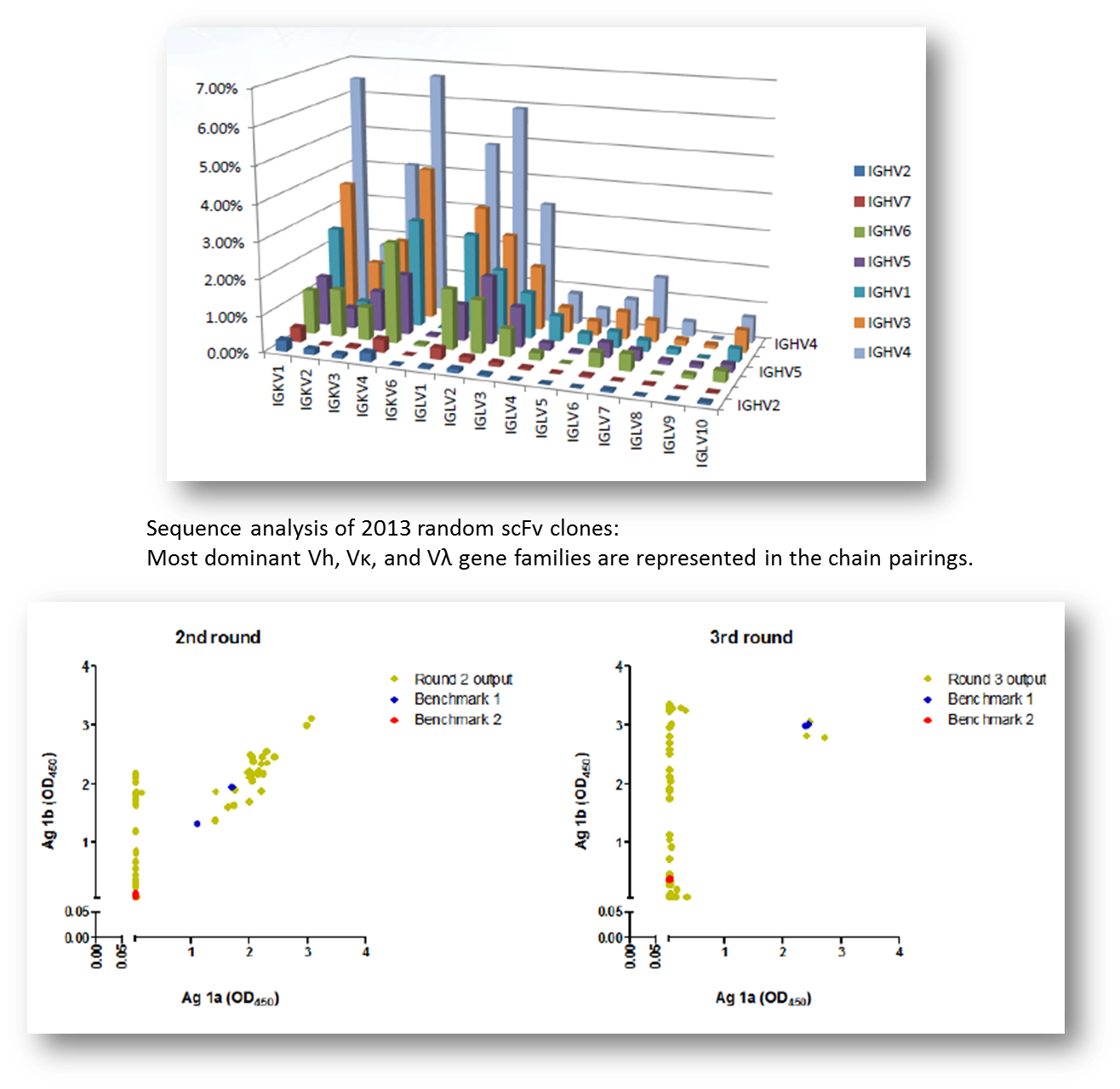 Human naïve library was panned on the splicing variant b of the human antigen 1 (Ag 1b) in the presence of splicing variant a (Ag 1a) as a competitor. Following panning, rounds 2 and 3 outputs were screened by monoclonal phage ELISA. Round 3 output shows significant enrichment with Ag 1b specific clones with concurrent reduction of Ag 1a/Ag 1b cross-reactive clones. Sequence analysis of round 3 hits identified 6 unique clones, 2 of which also showed strong binding to cell-surface expressed Ag 1b (data not shown here).
