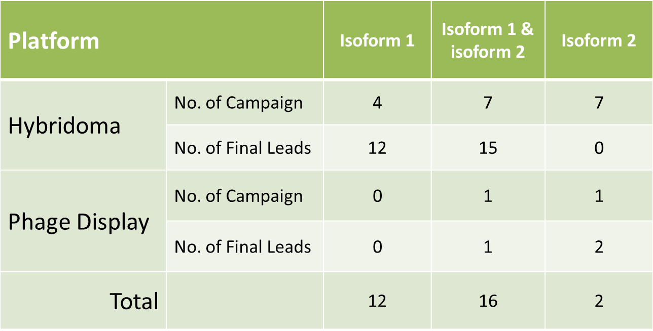 No functional hits specific to isoform 2 were identified by hybridoma, even after multiple campaigns.