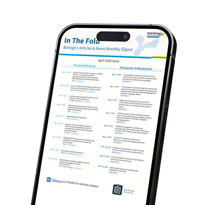 Access the latest issue of our monthly roundup featuring biologics news and scientific publications. The April 2026 issue includes 15+ curated news updates and 10+ peer-reviewed articles across antibody discovery, protein production, in vitro assays, and in vivo pharmacology, helping you stay informed on key updates in biologics discovery and development.