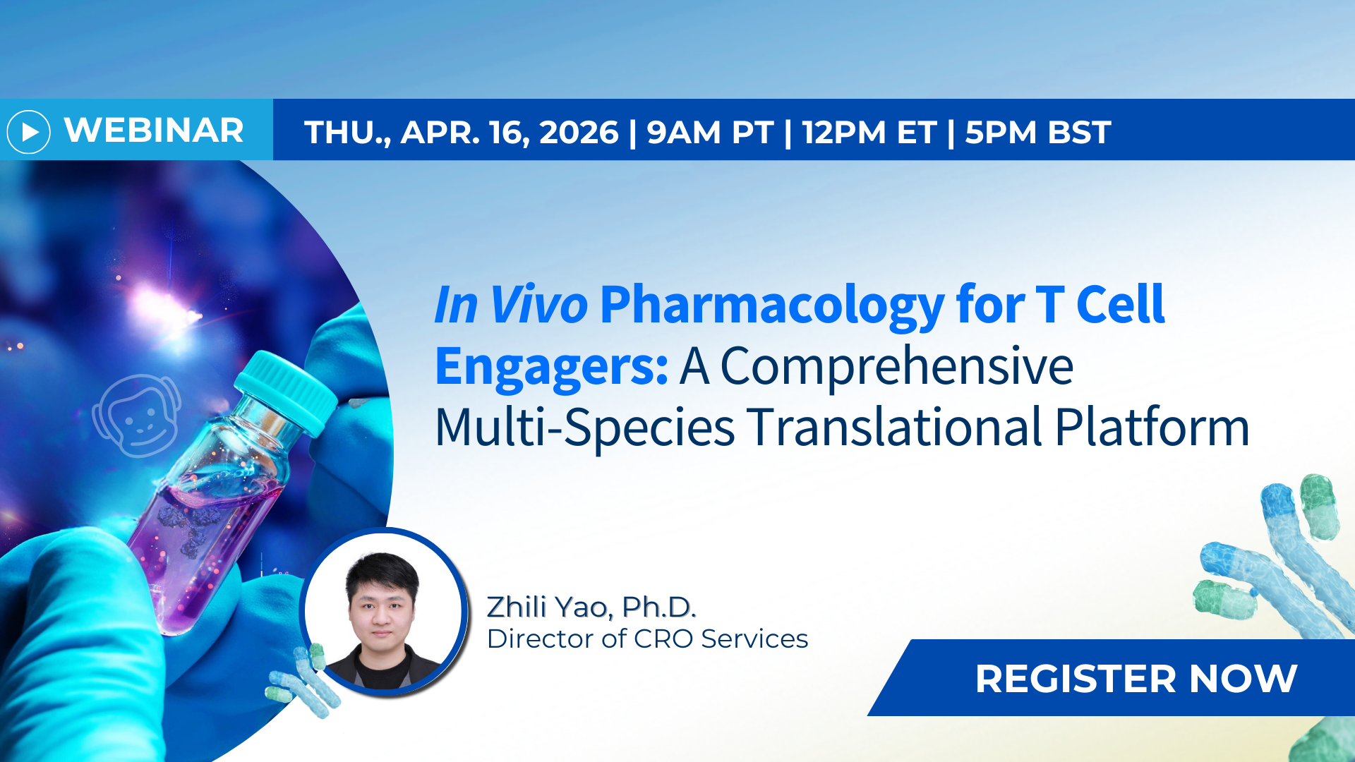 This webinar will introduce multiple in vivo models across species (cynomolgus NHPs, hFcRn mice, human PBMC/CDX models) for translational evaluation of TCE exposure-response relationships. Through detailed case studies, you will gain practical insights into TMDD-driven nonlinear clearance and associated PK/PD responses in NHP studies, dose-dependent toxicity, and correlating tissue T cell infiltration and translational PK studies, helping to refine study design, mitigate preclinical risks, and streamline the path toward clinical success.