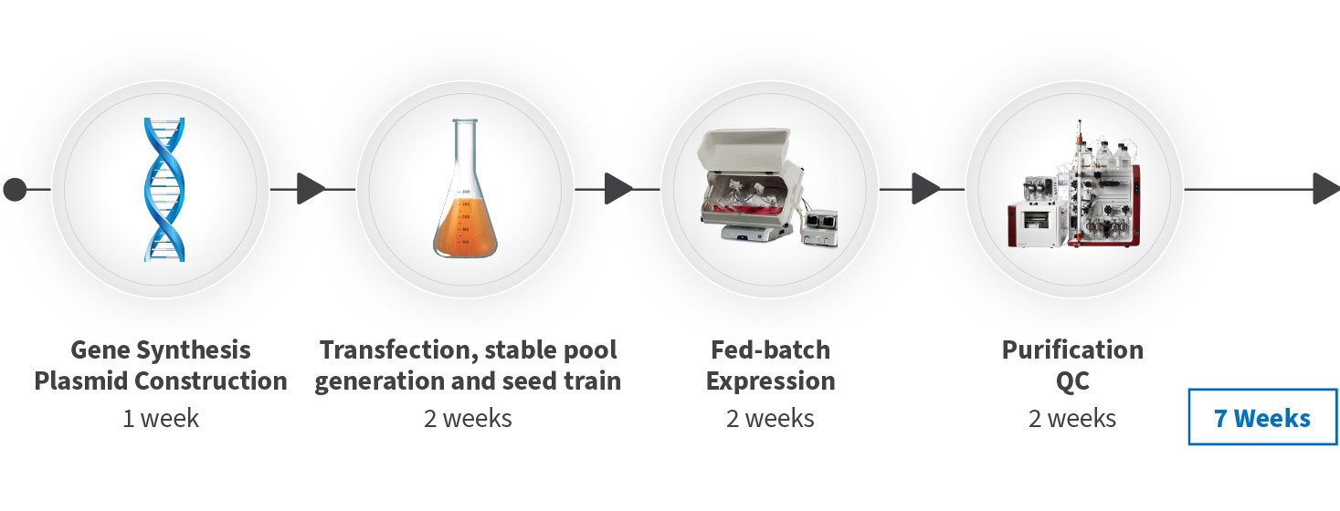 Our WuXian Express™ platform leverages a CHO stable pool expression system engineered for cost-effectiveness and efficiency, delivering purified proteins within 4-7 weeks from gene synthesis. This accelerated timeline is achieved through a meticulously optimized process, beginning with gene synthesis and plasmid construction in the first week. The process then advances to plasmid transfection and stable pool generation within two to three weeks, followed by protein expression over the next two weeks, and concludes with purification and quality control (QC) in the final two weeks.