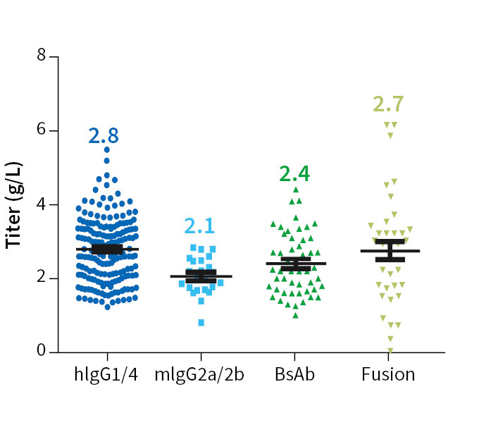 Figure A: The platform efficiently expressed multiple antibody and protein formats, achieving average titers of 2.8 g/L for hIgG1/4, 2.1 g/L for mIgG2a/2b, 2.4 g/L for bispecific antibodies, and 2.7 g/L for fusion proteins.