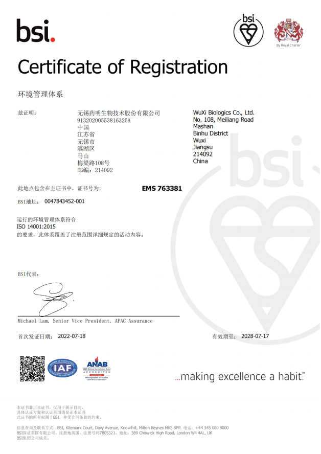 Pursuit of environmental sustainability has become a consensus of human society, and is considered an imperative for every business to achieve their long-term goals. At WuXi Biologics, we take innovative actions to address climate change and optimize our environmental management system, aiming to continue to greening our business and influencing the wider value chain.