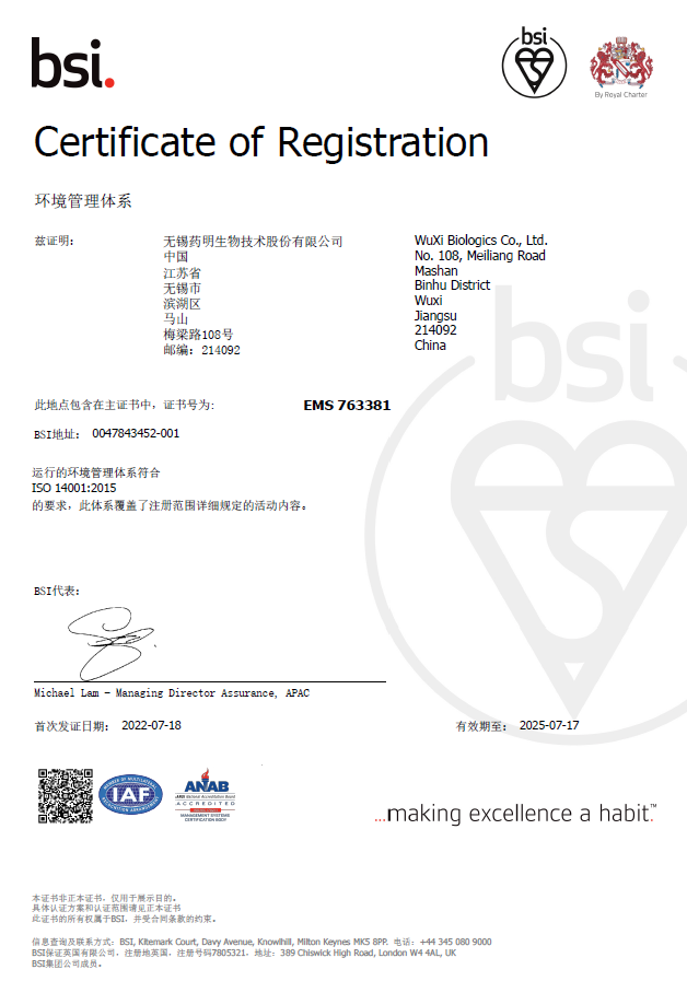 Pursuit of environmental sustainability has become a consensus of human society, and is considered an imperative for every business to achieve their long-term goals. At WuXi Biologics, we take innovative actions to address climate change and optimize our environmental management system, aiming to continue to greening our business and influencing the wider value chain.