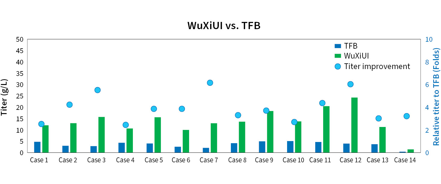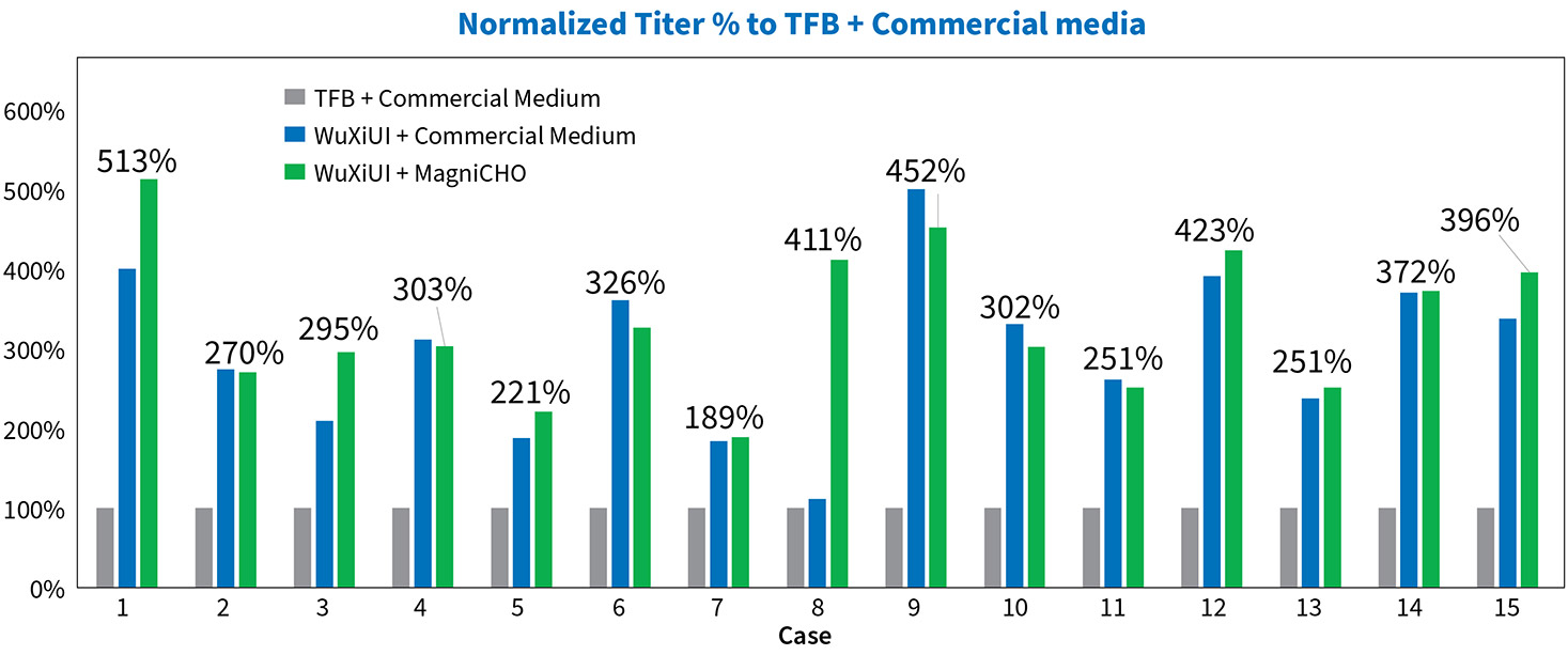 Specially formulated for use with the WuXiUI platform, the MagniCHO™ media further maximizes productivity to drive product titer higher. Using the WuXiUI platform in conjunction with MagniCHO demonstrated on average a 3.5-fold higher productivity and up to 35 g/L titer compared to a traditional fed-batch process using off-the-shelf media. In addition, we achieved a performance comparable to or greater when substituting MagniCHO for commercially-available media.