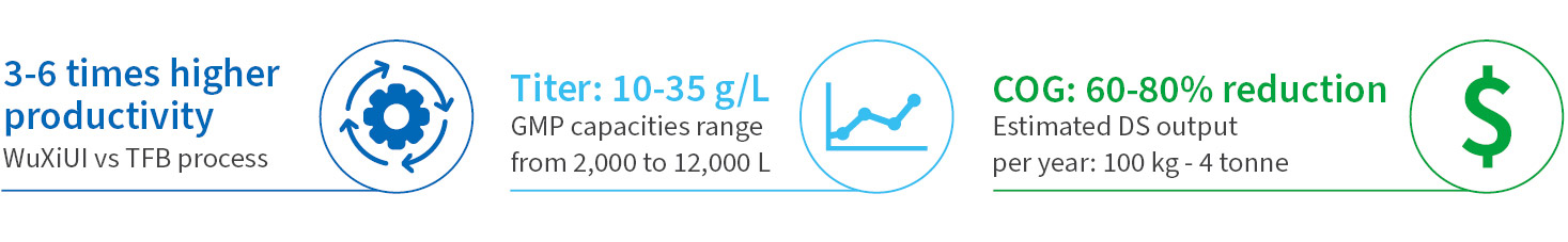 WuXi Biologics’ manufacturing platform WuXiUI™ introduces an ultra-intensified fed-batch strategy for highly improved upstream productivity and cost-effective commercial manufacturing. It leverages an innovative cell culture bioprocess with ultra-high seeding density and intermittent-perfusion fed-batch to achieve 3 to 6-fold higher productivity than traditional fed-batch processes while maintaining desirable product quality. The platform’s unique design allows for outstanding adaptability for all common cell lines and diverse modalities, and is readily scalable to 2000 L – 12,000 L (e.g., 6 x 2,000 L or 3 x 4,000 L) scales with high productivity and 60-80% reduced manufacturing cost of goods (COGs).
