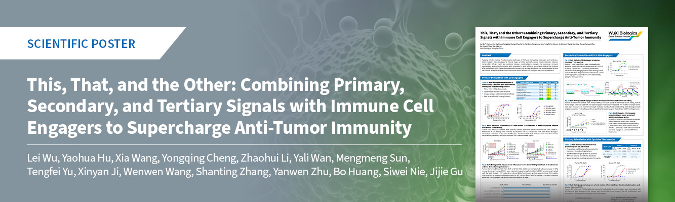 Tapping into the natural T cell activation pathways of TCRs, co-stimulatory molecules, and cytokines, WuXi Biologics has developed a clinical stage anti-CD3 antibody whose binding kinetics balance remarkable efficacy with low cytokine release, co-stimulatory engagers to overcome immune suppression, and cytokine muteins with improved PK and safety to sustainably expand the immune effector cell pool. With these complementary immune cell engager platforms and pharmacology service excellence, we aim to enable clients to discover novel immune cell engagers with clinical prospects.