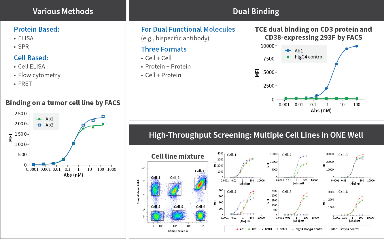 Figure A: The figure highlights a range of protein-based (ELISA or SPR) and cell-based (cell-ELISA, flow cytometry, or FRET) methods for assessing binding activity, some with high-throughput capabilities. It also features dual binding evaluations for bispecific antibodies and other complex molecules, as well as high-throughput screening for multiple cell lines within a single well.