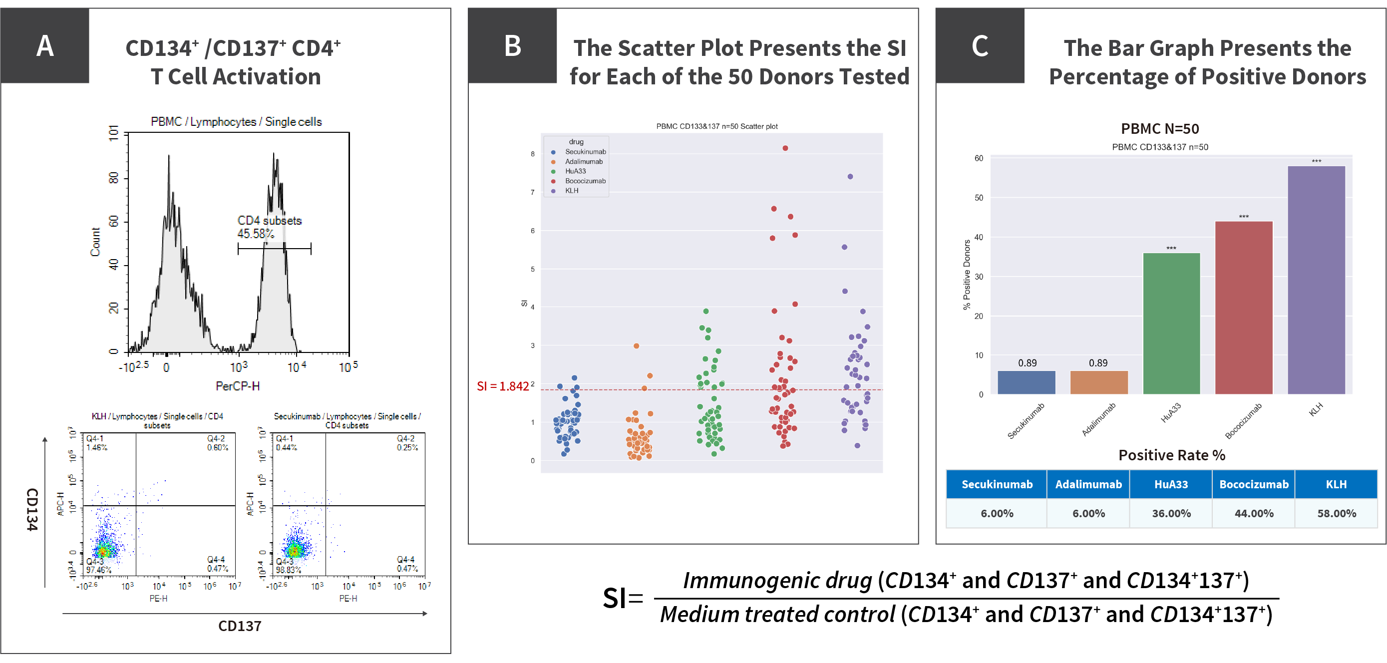 In this case study, we developed an assay to assess CD134+ /CD137+ CD4+ T cell activation by different antibodies or antigens, with CD134 (OX40) and CD137 (4-1BB) contributing to CD4+ T helper cell activation following stimulation. The proportion of cells positive for CD134 and/or CD137 distinguished biotherapeutics with low immunogenicity from those with intermediate or high immunogenicity.