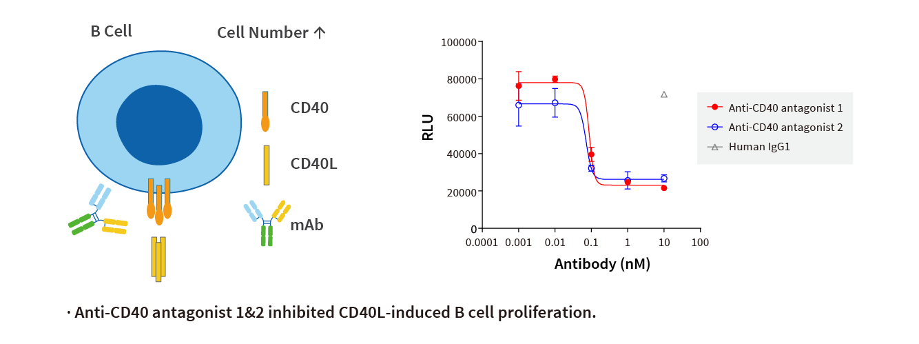 Case study on assay development to assess CD40L-induced B cell proliferation and its inhibition by therapeutic antibody candidates in a dose-dependent manner.