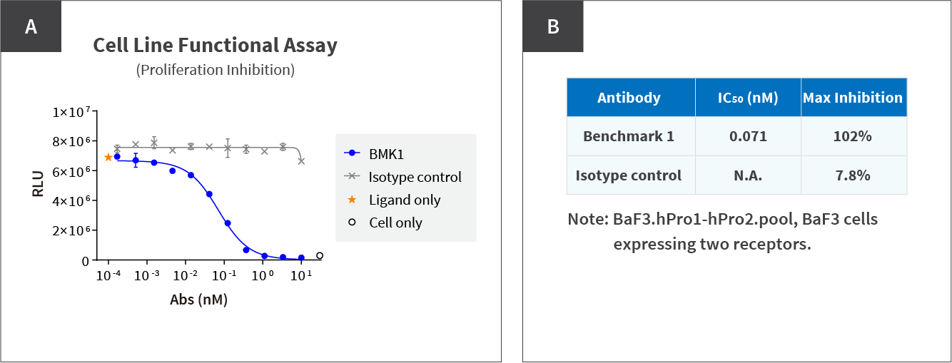 Figure 1: (A) BMK1 antibody significantly inhibited IL-31-dependent proliferation of BaF3 cells expressing two receptors. (B) BMK1 antibody demonstrated an IC50 of 0.071 nM and a maximum inhibition of 102%, whereas the isotype control showed minimal inhibition.