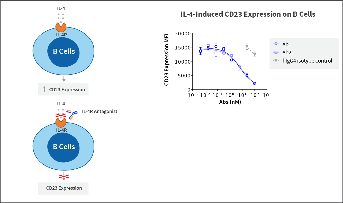 In this case study, we developed a FACS binding assay to assess the inhibition of IL-4-induced CD23 expression on B cells. The results demonstrated the potential of both antibodies to suppress B cell activation mediated by the IL-4/IL-4R signaling pathway.