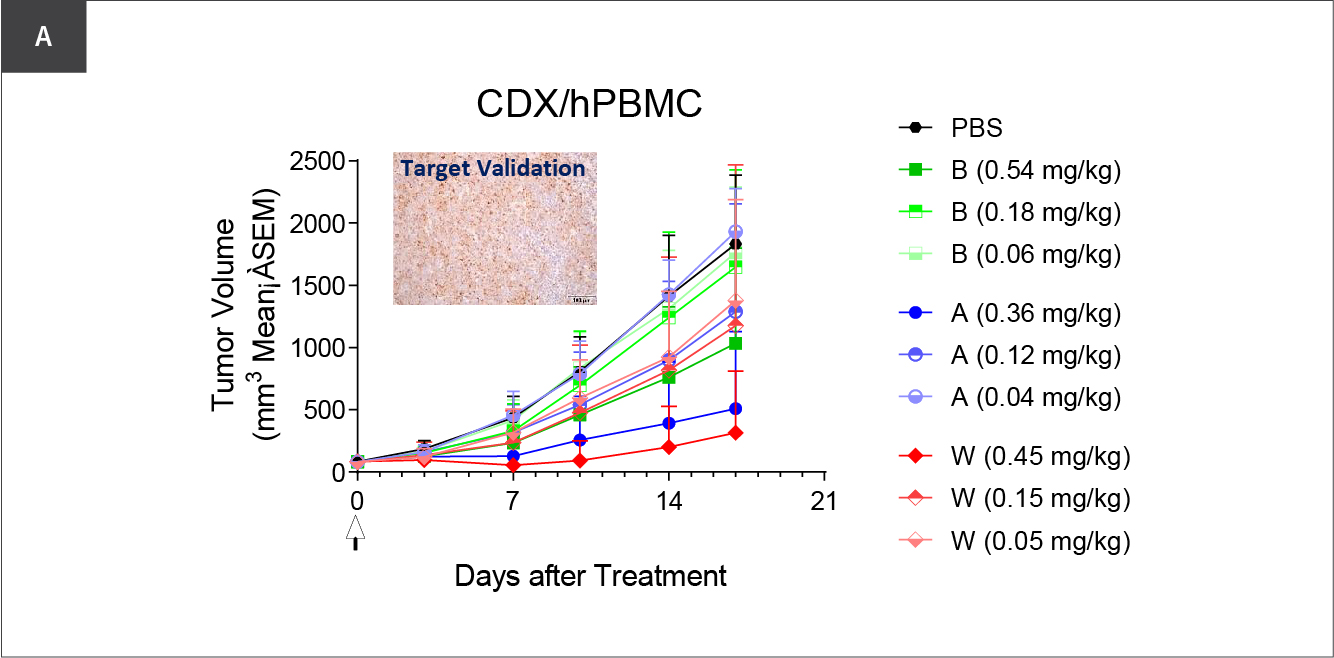 Figure A: We rationally selected a tumor model based on IHC target validation using prescreened donor to ensure reliable efficacy within a consistent therapeutic window. This CDX/PBMC model demonstrated high resolution with decent efficacy in tumor growth inhibition for bispecific TCE characterization.