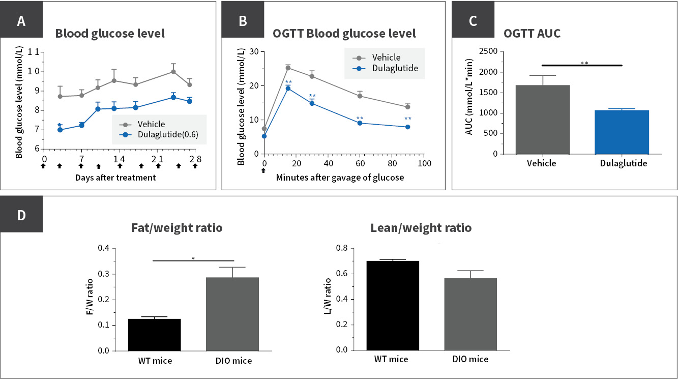This case study evaluates the anti-obesity efficacy of dulaglutide in a diet-induced obesity (DIO) model. The study monitored body weight changes, glucose tolerance, and fat mass reduction to assess the therapeutic impact of dulaglutide on metabolic dysfunction in obese mice.