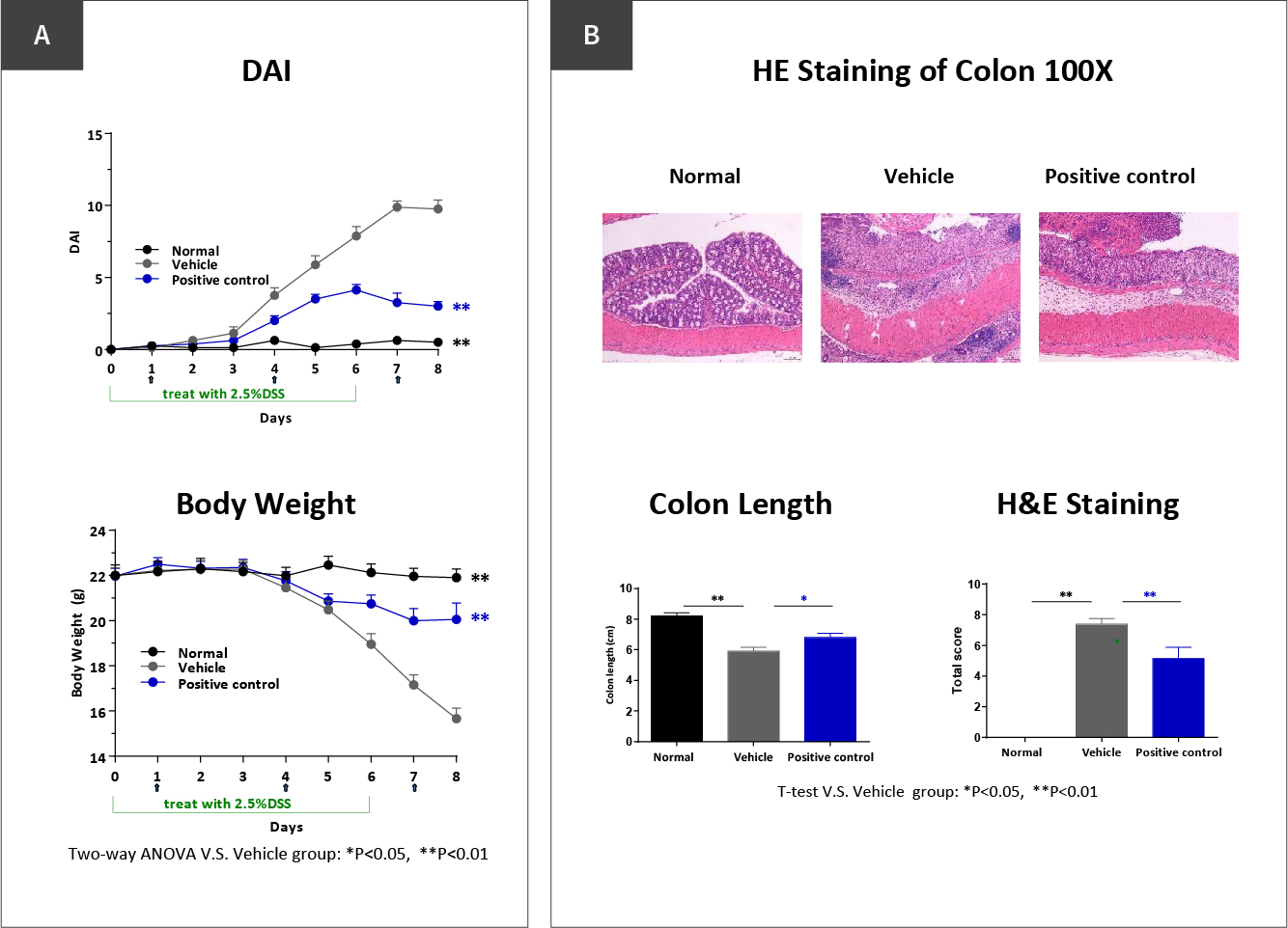 Figure 1: (A) Body weight changes and disease activity index (DAI) in DSS-treated mice demonstrated significant protection by the antibody treatment (blue) compared to the untreated control group (gray). (B) Histopathological analysis of colon tissues showed reduced inflammation and restored mucosal structure in the antibody-treated group, measured by H&E staining. Quantitative scoring of histological sections further confirmed a significant improvement in tissue morphology following treatment.