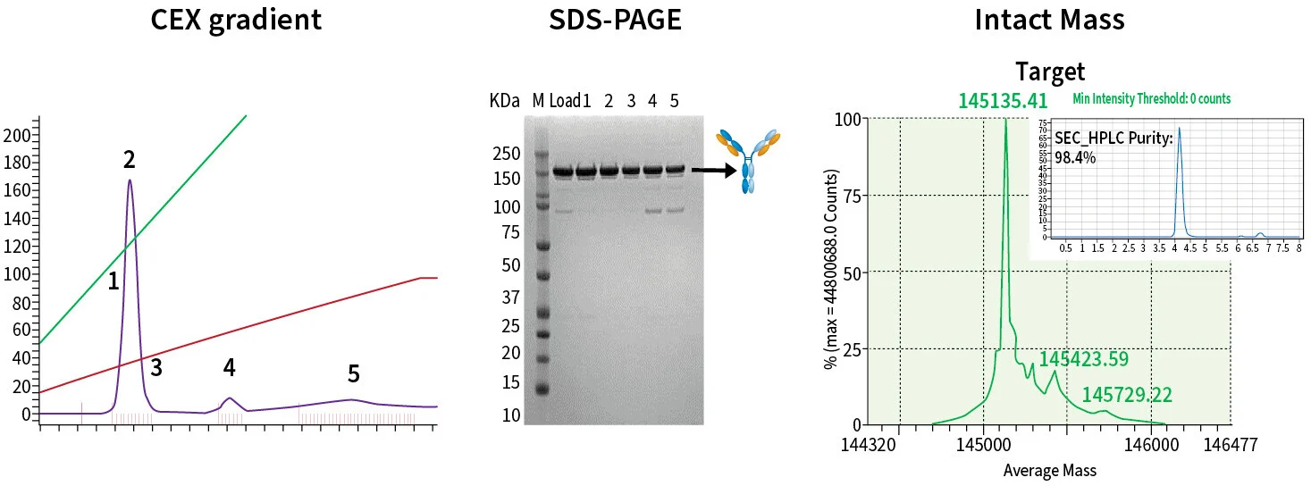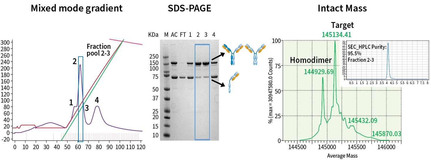 In this case study, a common LC bsAb was produced using LC-MS-assisted purification. Following affinity purification, mixed mode, and CEX polishing, half antibodies and homodimers were effectively removed, resulting in final bsAb product with 98.4% purity.