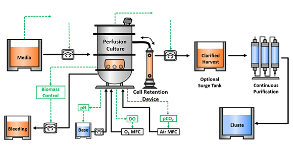 We don’t see many product related limits when using a continuous process scheme compared to a traditional fed-batch process. In fact, continuous manufacturing can accommodate a wide variety of molecules – including mAbs, fusion proteins, growth factors, recombinant enzymes, etc. – many of which could not be produced in other cell culture modes (such as fed-batch) due to product stability issues. The only limit we’ve observed is that some specific molecules may have product retention issues during continuous harvest when using certain types of hollow fiber filter (HFF)-based cell separation devices due to the proteins’ large molecule weight or other unique characteristics of the molecule. The challenge can usually be addressed by screening of different membrane materials and evaluation of membrane pore size and membrane area in the HFF system during process development. Alternatively, other cell retention devices with different mechanisms of action can be also considered, like those based on gravitation (inclined cell settlers, centrifugation) or acoustic resonance systems.