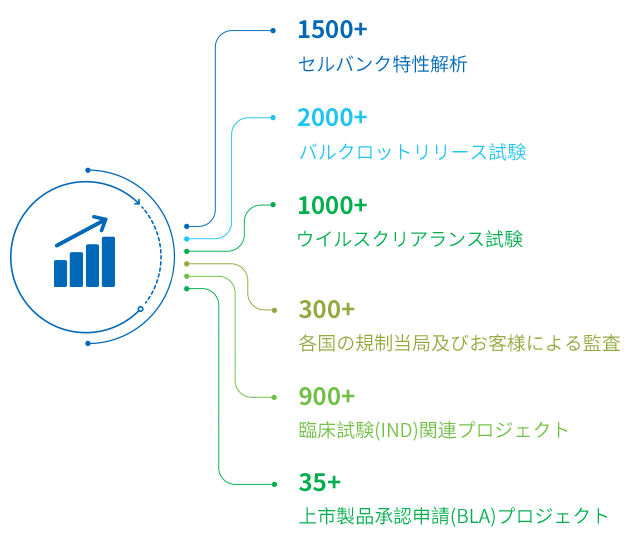 セルバンク特性解析は2.5ヶ月間、INDウイルス·クリアランス試験は2ヶ月間、バルク·ロットリリース試験は6週間で実施 新型コロナウイルスの流行以来、複数の中和抗体やワクチン製品の各国における承認取得を短期間で効率的にサポートした実績