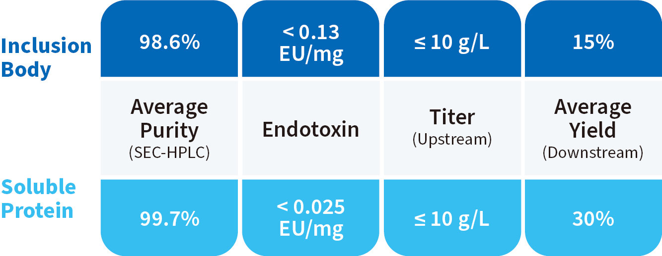 We offer multiple design options to optimize cytokine expression as either inclusion bodies or soluble proteins. Our approach tailors development to suit desired yield, solubility, and downstream processing needs.