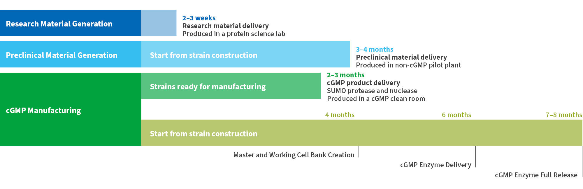 • Rapid timelines: Get research material in 2 to 3 weeks, preclinical material in 3 to 4 months, and Current Good Manufacturing Practices (cGMP)-grade enzyme production in 7 to 8 months—all with the highest quality standards.