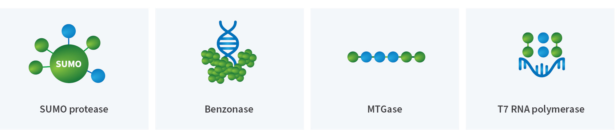 We support the following enzymes and many other products. SUMO protease promotes protein recovery, Benzonase removes unwanted nucleic acids, and microbial transglutaminase (MTGase) enhances protein stability and crosslinking. Molecular biology applications rely on T7 RNA polymerase for high-yield RNA synthesis.