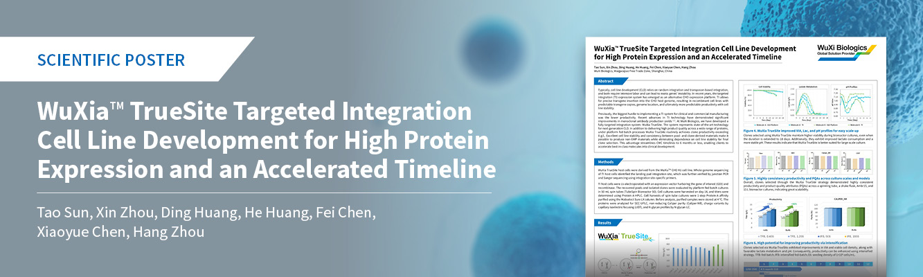 WuXi Biologics’ TrueSite TI is a next-generation TI system delivering high product quality and clone productivity exceeding 8 g/L under platform fed-batch processes.With strong consistency between pool- and clone-derived materials, it enables non-GMP production without stability concerns, reducing CMC timelines to 6 months or less. TrueSite TI accelerates best-in-class molecules into clinical development efficiently and reliably.