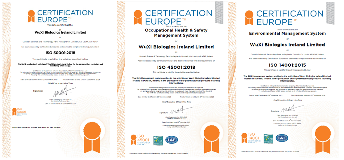 WuXi Biologics Ireland Site Receives Three ISO Certifications