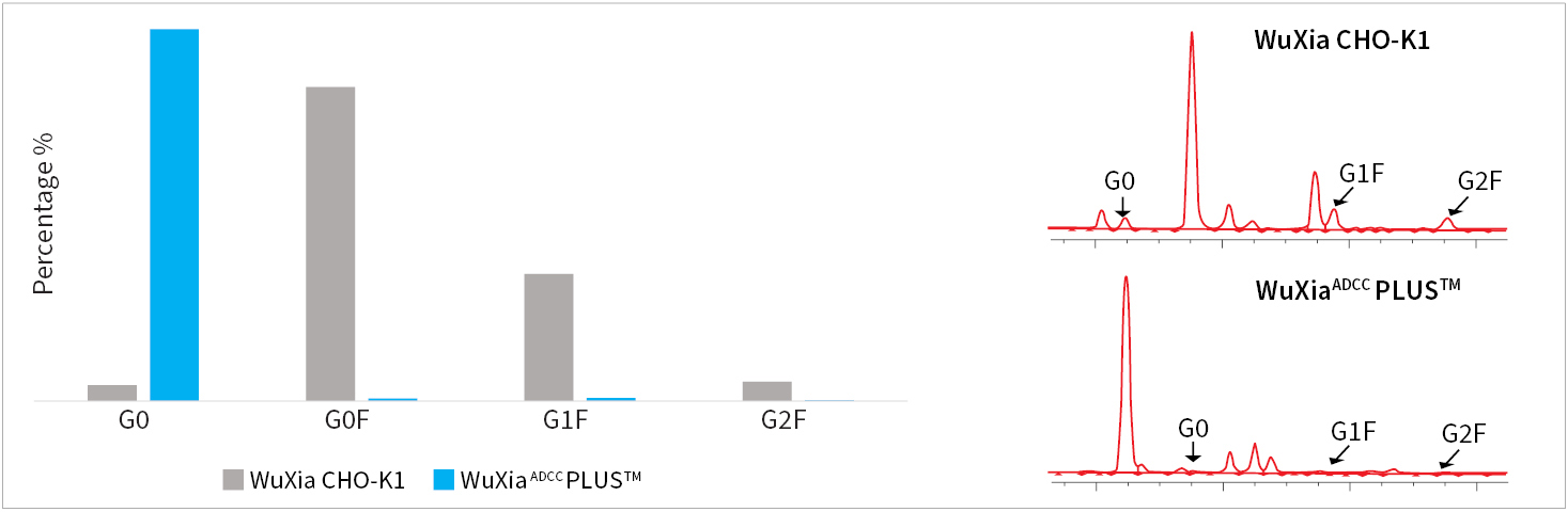 Removal of fucose on the N-glycosylation site is an efficient and cost-effective way to enhance ADCC activity and increase the potency of antibody-based immunotherapies. To meet growing global demand for the production of afucosylated antibodies, the WuXiaADCC PLUS™ cell line was developed to address this need. WuXiaADCC PLUS was derived from the WuXi Biologics’ highly-vetted WuXia™ CHO-K1 cell line, and as such, the WuXiaADCC PLUS cell line exhibits comparable robust growth and metabolic profile to the WuXia CHO-K1 parental cell line.